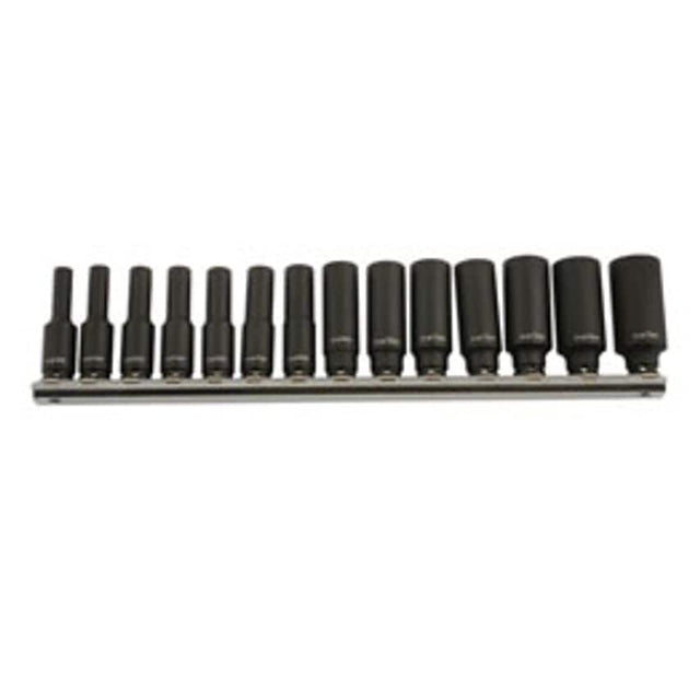 Set of deep impact quality 1/4" square drive sockets in single hex (6pt) profile. Featuring a longer 50mm depth for improved access over standard sockets. Covers smaller sizes from 4mm to 15mm, including some useful half sizes. Allows the use of impact tools with smaller nuts and bolts. Ideal for quick and easy removal of rusted components and a time saver when there are a lot of fixings. Provided on a socket rail for easy, accessible storage so the sockets are easy to hand. A good value, problem solving set for the workshop. Socket sizes: 4, 4.5, 5, 5.5, 6, 7, 8, 9, 10, 11, 12, 13, 14, 15mm.1/4"D x Single Hex (6pt) x 50mm deep. Manufactured from chrome molybdenum with black phosphate finish. Supplied on a socket rail for safe storage.