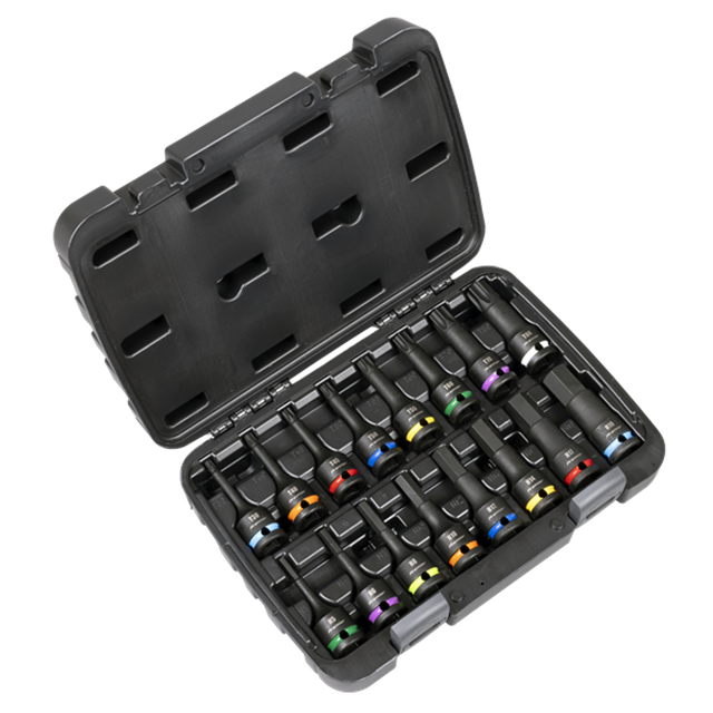 Chrome Molybdenum steel impact sockets with 1/2"Sq drive. Phosphate finish for added corrosion resistance. Colour-coded rings for fast identification. Suitable for use with any impact tool. Supplied in storage case.