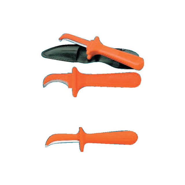 One piece insulated knives thus avoiding possible air gaps or other potential hazards and making the knives safe for use up to 1000V. The knives are well balanced for effortless cutting and safe with finger stops to avoid injury. All knives are supplied in a protective sheath.