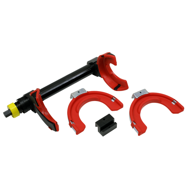 Suitable for MacPherson strut coil springs. Supplied with two pairs of different sized interchangeable yokes, for left-handed coil springs. Plastic yoke protectors that protect the spring coating from damage, which can invalidate the vehicle manufacturer's guarantee. Safety yokes carefully shaped to stop the spring bowing while under compression.