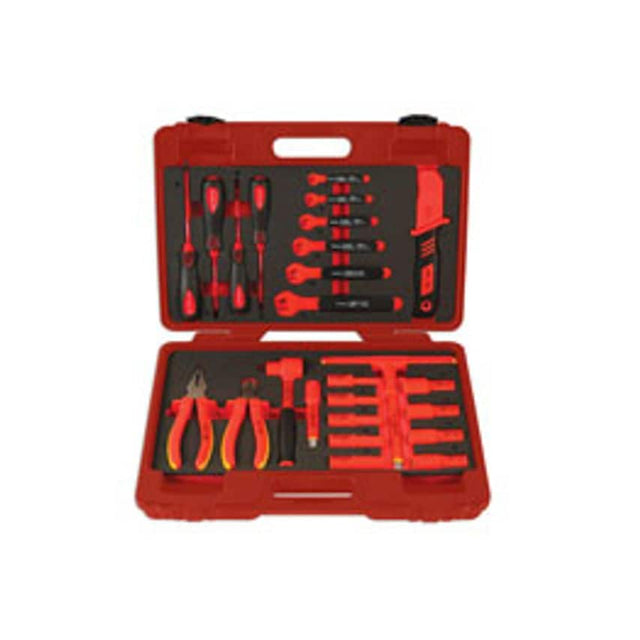 Fully insulated tool set, for live working up to 1000V AC / 1500V DC, from 7mm - 22mm, including a range of deep single Hex sockets, pliers, wrenches and screwdrivers. 9 x 3/8"D sockets: 7, 8, 10, 12, 14, 15, 17, 19, 22mm. Length: 71mm.Accessories: combination pliers 175mm; side cutter 150mm; 3/8"D 72 teeth ratchet; extension bar 100mm; T-handle. 6 x open end spanners: 7, 8, 10, 12, 14, 17mm; cable knife. 4 x screwdrivers: Phillips: Ph1 x 100mm, Ph2 x 100mm; Flat: 5.5 x 125mm, 4 x 100mm.