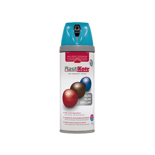 The PlastiKote Twist & Spray Premium Gloss Paint gives an enhanced, consistent coverage. The easy spray technology provides added control to make spray painting easier, faster and cleaner. Each coat is ultra-smooth, providing flawless coverage which dries quickly to a tough, durable finish. The paint can be recoated at anytime for simple, faster project completion. The can's large, comfortable finger pad requires 33% less finger pressure than other spray paint cans, and the twist and lock mechanism means there is no separate top to remove or replace after use. Its cap and button design shields the finger from paint for a cleaner spray painting process. Suitable for: wood, metal, plastic, stone, wicker and crafts. Drying Time: touch dry in 30-50 minutes.Coverage: 2.23m per can.