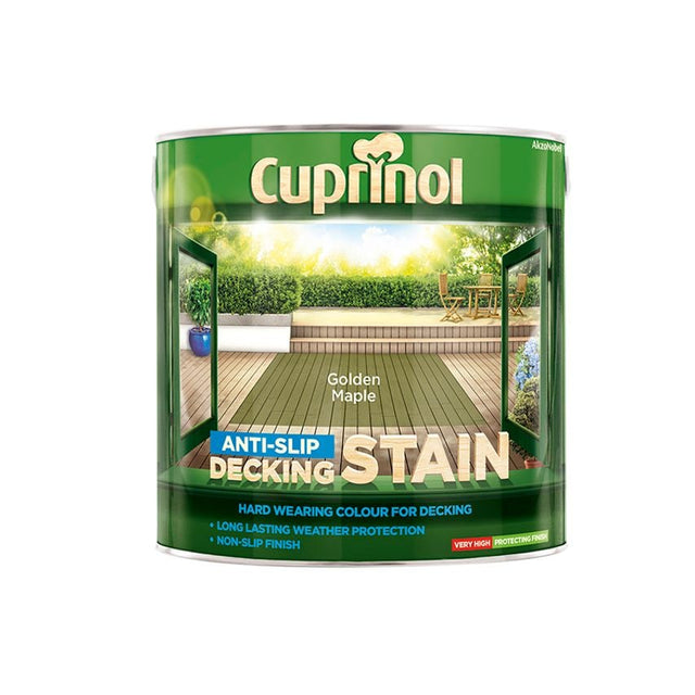 Cuprinol Anti-Slip Decking Stain with invisible anti-slip microbeads gives a semi-transparent matt finish specially formulated for all types of timber decking. It provides both colour and a tough durable protective coat that resists cracking and peeling. It is water repellent to help prevent wood cracking and splitting and it is showerproof in less than an hour. Also suitable for use on other garden wood and is safe for plants and pets when dry. It has an average coverage of approx. 20m with 2 coats