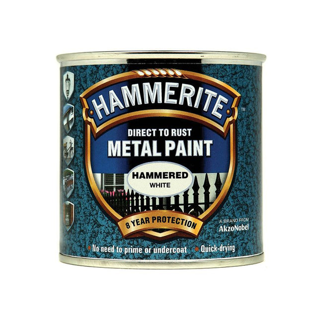 Hammerite Direct To Rust Metal Paint can be painted directly onto rusty surfaces and, thanks to its special 3 in 1 formula, there is no need to use a primer or undercoat - saving you precious time! Hammerite forms a superior barrier that not only seals out moisture, but also gives long-lasting protection, both inside and outside. Touch dry in an hour, Hammerite is corrosion resistant and is suitable for use on a wide range of exterior metal including gates, railings, drainpipes, guttering and garden furniture. The paint has a subtle hammered effect with a metallic sheen. Protects for up to 8 years.