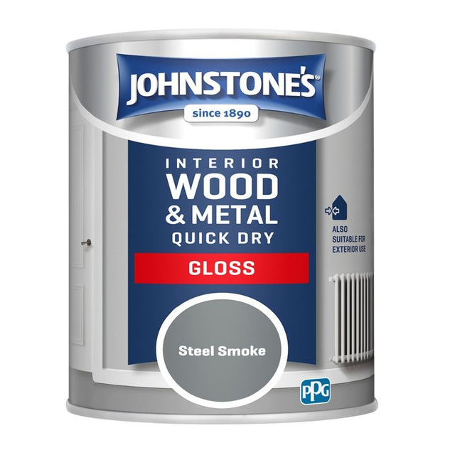 Johnstone's Quick Dry Gloss 750ml Steel Smoke Johnstones Quick Dry Gloss is a high opacity gloss paint for interior and exterior wood and metal surfaces, including skirting boards, doors, radiators and staircases. Low odour, water based formulation. Dry time: 1-2 hours Coverage: 8m2 (per tin) .