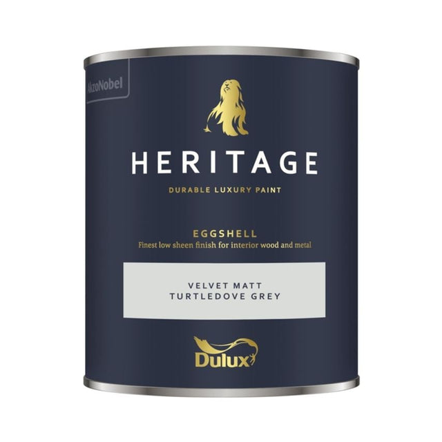 Dulux Heritage Eggshell 750ml Turtledove Grey Heritage finest quality eggshell is for use on wood and metal. It is formulated to provide the most stunningly smooth eggshell finish to complement the Heritage Velvet Matt for walls. Durable and hardwearing, it will protect the wood and metal work throughout your home, ensuring it remains beautiful for years to come. Choose from the range of expertly selected colours, inspired by some of the most beautiful periods in British design history.