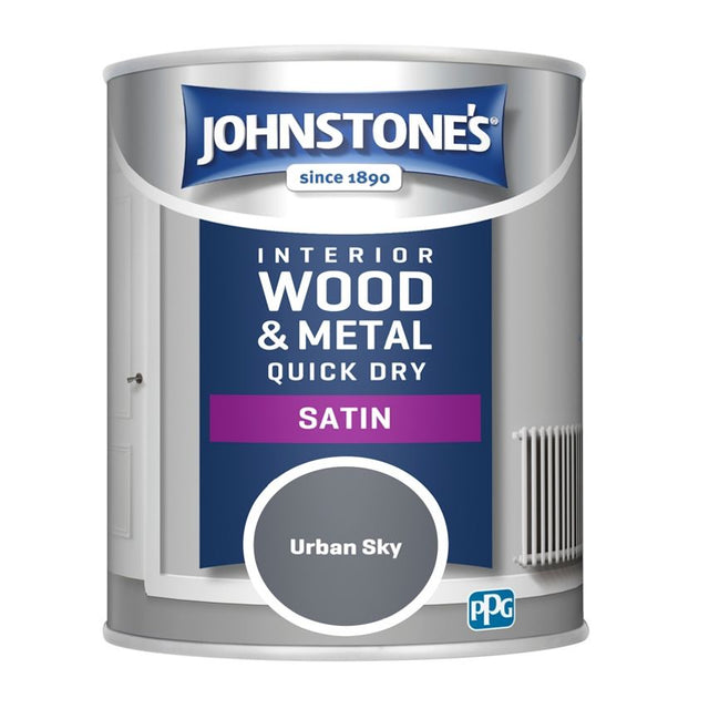Johnstone's Quick Dry Satin 750ml Urban Sky Johnstone's Quick Dry Satin provides a contemporary, tough and durable mid sheen finish for interior wood and metal. The water based, low odour formula is self undercoating, which makes this paint both quick and easy to use Coverage: 12m2 (metres squared per litre) Touch dry: 1-2hrs Waterbased