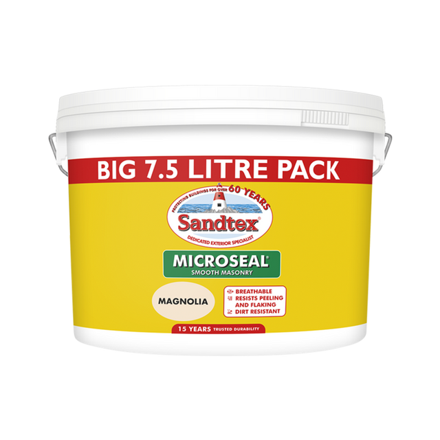 Sandtex Smooth Masonry 7.5L Magnolia Microseal technology, masonry paint ensures that surfaces are dirt resistant, breathable and waterproof for flawless coverage and protection for longer