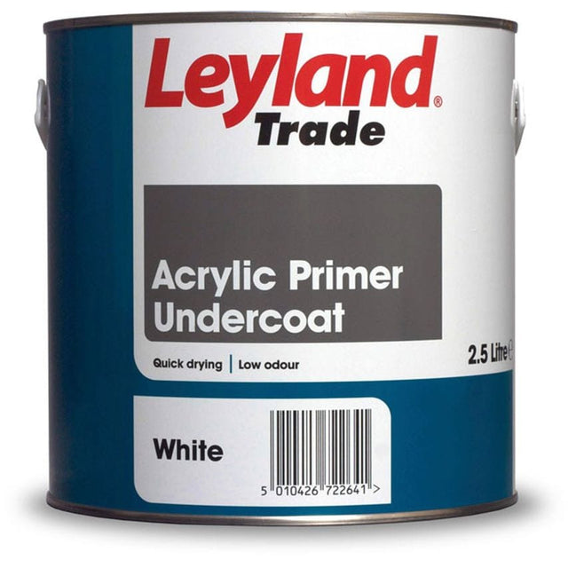 Leyland Trade Acrylic Primer Undercoat 2.5L White An acrylic based primer undercoat. Easy low odour application, adheres well to most surfaces including rubbed down gloss finishes Suitable Usages: Suitable for use on bare timber and masonry surfaces, both interior and exterior application Coverage: Approximately 13 sq.m. per litre Drying Time: Touch Dry in 1-2 hours Water-borne formula