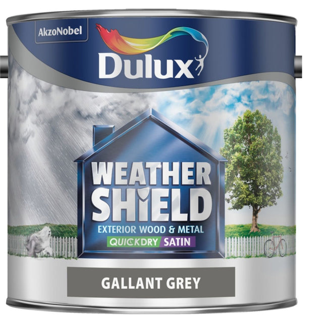 Dulux Weathershield Quick Dry Satin 2.5L Gallant Grey Weathershield Exterior Satin has 6 year weathering durability guaranteed provided surfaces are in good condition and the system is correctly applied This beautiful subtle sheen finish is recommended for use on front doors and windows Water-borne formula