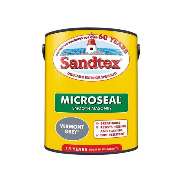Sandtex Smooth Masonry 5L Vermont Grey Microseal technology, masonry paint ensures that surfaces are dirt resistant, breathable and waterproof for flawless coverage and protection for longer