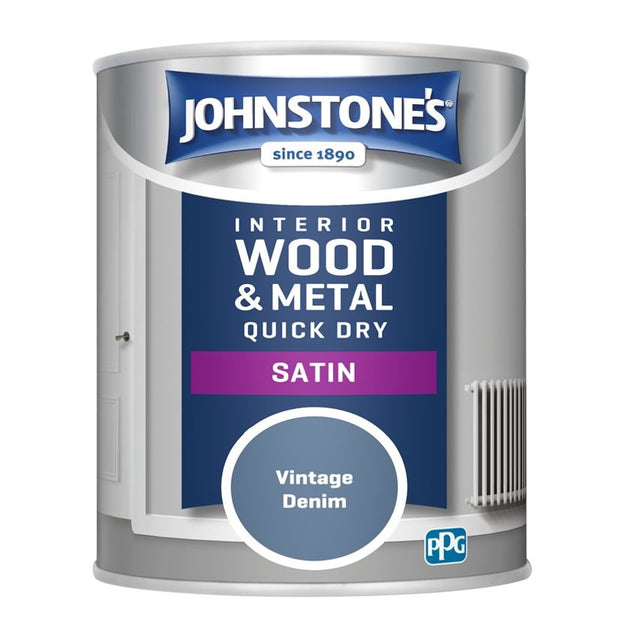 Johnstone's Quick Dry Satin 750ml Vintage Denim Johnstones Quick Dry Satin is suitable for use on interior wood and metal including skirting boards, doors, radiators and staircases. Provides a contemporary, mid sheen finish. Low odour, water based formulation. For best results, use with Johnstone's Quick Dry Primer Undercoat. Dry time: 1-2 hours Coverage: 9m2 (per tin) . Due to geographical locations we are unable to deliver to: Isle of Wight, Isle of Man and Ireland.