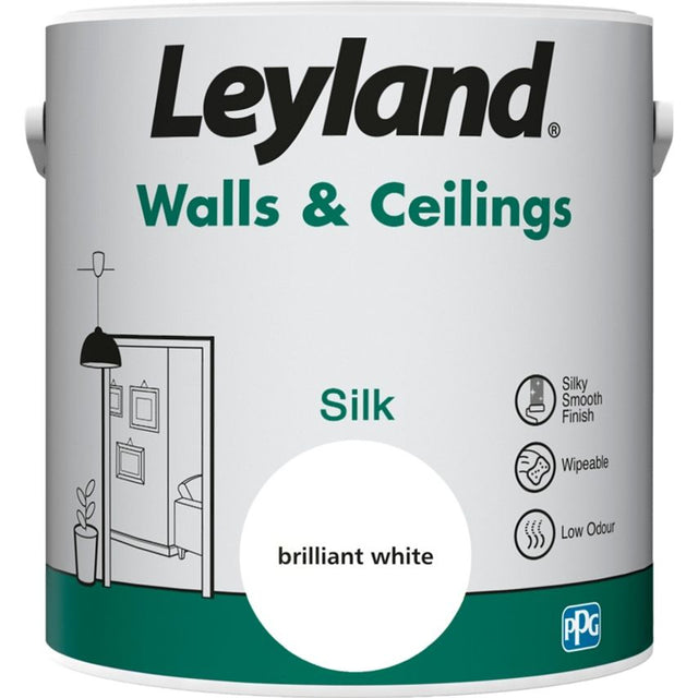 Leyland Walls & Ceilings Silk 2.5L Brilliant White Leyland Walls & Ceilings Silk Emulsion is a smooth and durable low odour paint. The high sheen finish can be cleaned and is suitable for use on interior walls and ceilings. Dry time: 4 hours. Coverage: up to 14m (per litre)