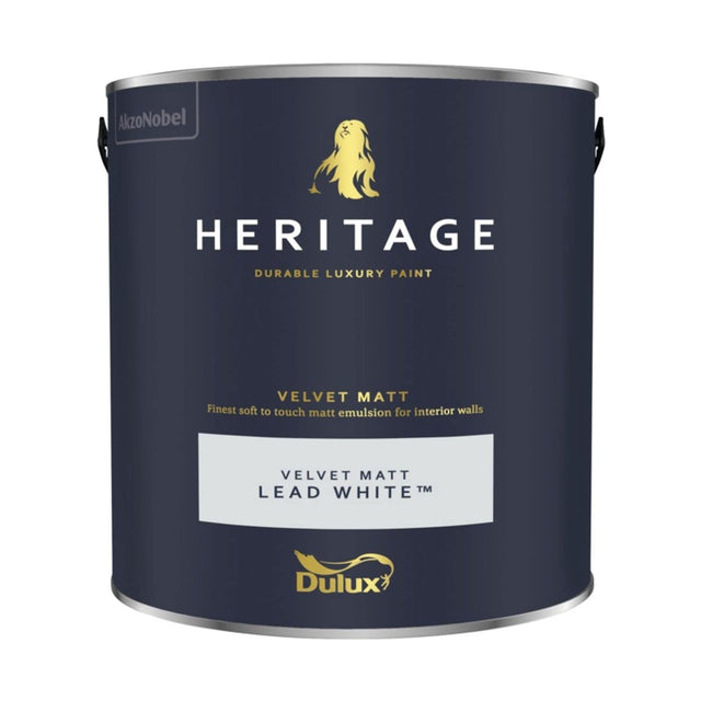 Dulux Heritage Matt 2.5L Lead White This luxury washable matt emulsion is formulated with premium quality pigments to guarantee excellent depth of colour and with specially-blended clays for effortless application, and an irresistible soft to touch finish. Choose from a range of expertly selected colours, inspired by some of the most beautiful periods in British design history.