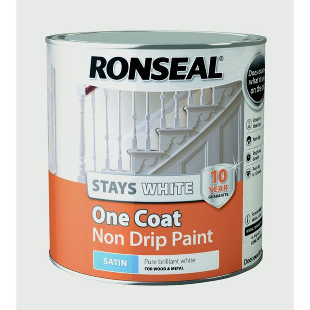 Ronseal Stays White One Coat Non Drip Paint White Satin 2.5L Our Stays White Non Drip One Coat Paint is great if you've not got much time or just want to get the job over with. Just One Coat will give you a great finish on wood, skirting, trim, doors and window frames. Its non drip, so ideal for vertical spindles and fiddly jobs. It's low odour, dries quickly, easy to clean up, plus its guaranteed to Stay White for 10 years. Covers in one coat Non drip Touch dry in 1-2 hours Guaranteed to stay white