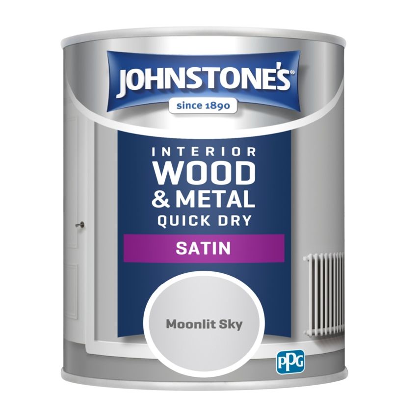 Johnstone's Quick Dry Satin 750ml Moonlit Sky Johnstone's Quick Dry Satin provides a contemporary, tough and durable mid sheen finish for interior wood and metal. The water based, low odour formula is self undercoating, which makes this paint both quick and easy to use Coverage: 12m2 (metres squared per litre) Touch dry: 1-2hrs Waterbased