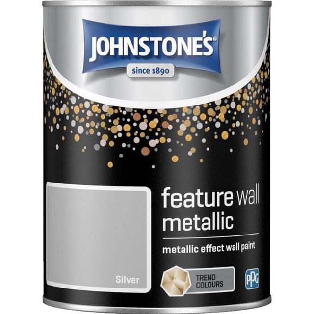 Johnstone's Feature Wall Metallic 1.25L Silver Feature Wall Metallic paint offers a range of sophisticated metallic colours designed to help you achieve stunning feature walls with a difference. Use it creatively to apply unique shapes or stripes as an accent feature or apply as an overall metallic effect finish to your walls. Sheen Level = 5 Touch Dry = 1-2 Hours Coverage = 15m2 per tin