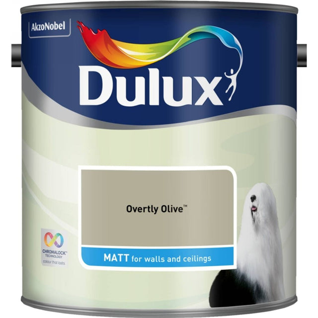 Dulux Matt 2.5L Overtly Olive Dulux Matt is a wipeable, smooth and creamy emulsion paint with excellent coverage that minimises imperfections creating the most contemporary look for walls and ceilings