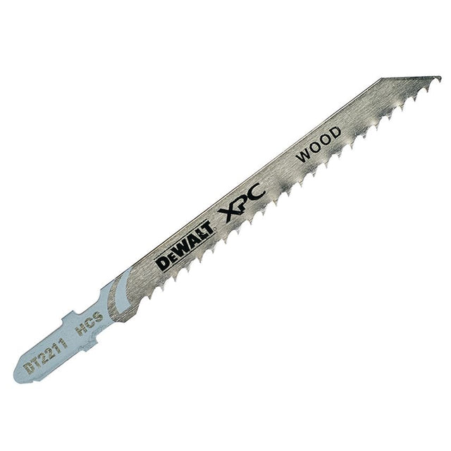 The DEWALT XPC Jigsaw blades have a optimised tooth angle which provides long life and clean tear-free cuts at high speeds in all wood materials. With a thicker blade body, increased taper angle and optimised tooth geometry for greater accuracy and control of cut. They have a slim narrow angled tooth design for clean cutting with less material breakout. The Plunge Point tip allows for easy plunge cutting into all wood and wood substitute materials. Optimum tooth geometry provides increased blade and tooth strength and premium steel body for longer blade cutting life. Larger deeper gullets between teeth for easier wood chip removal and faster cutting. For use in hard and soft woods including laminates, plywood, chipboard and plastics.
