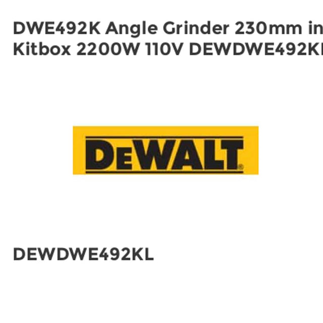 The DEWALT DWE492K Angle Grinder has an abrasion protected motor for increased durability. The two position side handle allows the user to optimise the handle position to give maximum comfort. The grinder has a brush window for quick brush replacement and a spindle lock for quick wheel changes. Supplied with: 1 x Protective Guard, 1 x Side Handle, 1 x Inner & Outer Disc Flanges, 1 x Spanner and 1 x Kitbox. Specifications: Input Power: 2,200W.No Load Speed: 6,600/min.Max. Disc Diameter: 230mm.Spindle Thread: M14.Length: 490mm.Height: 151mm.Weight: 5.2kg.