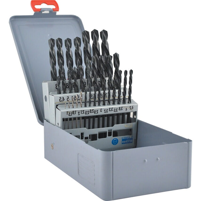 201 0,019 32 piece HSS Type N straight shank jobber drill set in metal case. To EN338. Contents: 1.0-10.5 in 0.5mm increments. Supplementary sizes: 1.9, 2.1, 2.6, 2.9, 3.2, 3.3, 3.8, 4.2, 5.1, 6.8, 7.9 and 10.2mm.