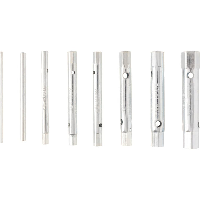 Manufactured from high quality steel tube and zinc plated for corrosion resistance, this double ended box spanner set possesses 7 metric sized box spanners. Each spanner is supplied with a tommy bar. Features and Benefits Tubes are manufactured from steel for optimum durability Each piece is zinc plated for bolstered resistance to corrosion Supplied with tommy bars 7 piece set ensures you have the correct sized box spanner to hand for varied applications Contents 6 x 7mm 8 x 9mm 10 x 11mm 12 x 13mm 14 x 15mm 16 x 17mm 18 x 19mm Typical Applications Engineering Automotive Construction