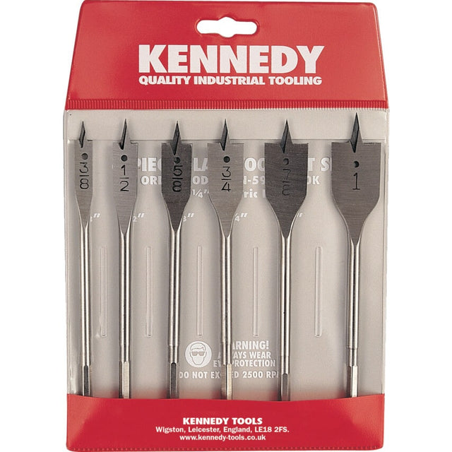 Forged from high quality tool steel with chip clearance groove and hollow ground point. Centerless ground and true running. Ground spade bit head. For cutting holes in laminates and wood. 6mm hexagon shank to prevent slipping at speed. Supplied in wallet. Contents: 9 (3/8), 13 (1/2), 16(5/8), 19 (3/4), 22 (7/8) and 25mm (1).