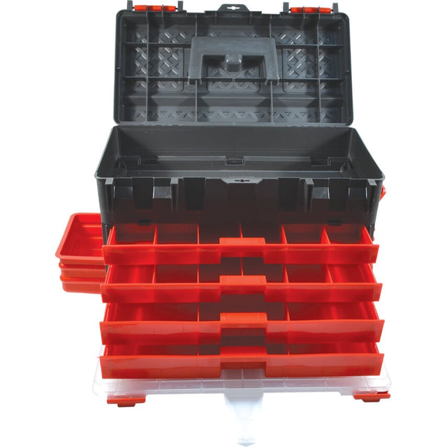 Manufactured from high impact co-polymer polypropylene. Metric graduated V-groove in the lid securely holds work-piece while being cut. Features four sliding drawers enclosed with a slide clasp front panel to prevent opening whilst in transit. Top carry handle with soft touch grip zone and large locking clasps. Front cover panel and lid have aligning padlock hole for added security.
