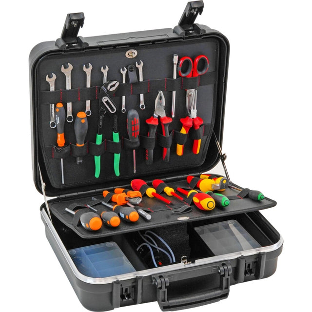 Ribbed high strength plastic case with aluminium reinforced trim. Two fitted and hinged tool boards with elasticated tool retaining loops. Lockable with two keys. Padded carry handle.