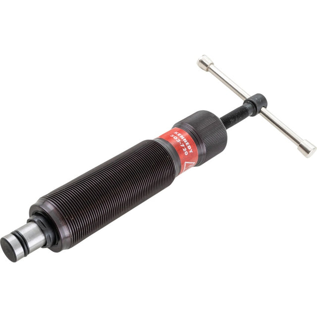 10 tonne capacity grease filled hydraulic ram with spring loaded plunger. Provides direct non-twisting application of thrust that is more effective and secure than a mechanical thrust screw. Fully threaded body allows for quick and easy height adjustment. With tommy bar. Fits most brands of pullers and ball joint separators including Kennedy, Sykes-Pickavant, Sealey, Draper, Bergen, Clarke etc. Capacity: 10 tonne. Length excluding handle: 190mm. Diameter of ram: 40mm. Thread pitch: 16 gauge x 3/8 BSW