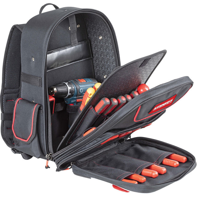 The Kennedy Tool Backpack is a practical and durable solution for storing and transporting tools and work equipment with ease. Designed for comfort and convenience, it includes a padded handle, adjustable shoulder and belt straps, and extra back padding for enhanced support while on the move. The spacious main compartment includes a double-sided tool panel with padlockable zip closures for added security, while the middle compartment offers pouches for organising smaller components. Four rubber feet at the base help prevent floor damage, making it a reliable choice for professionals who need a secure and comfortable way to carry their tools.