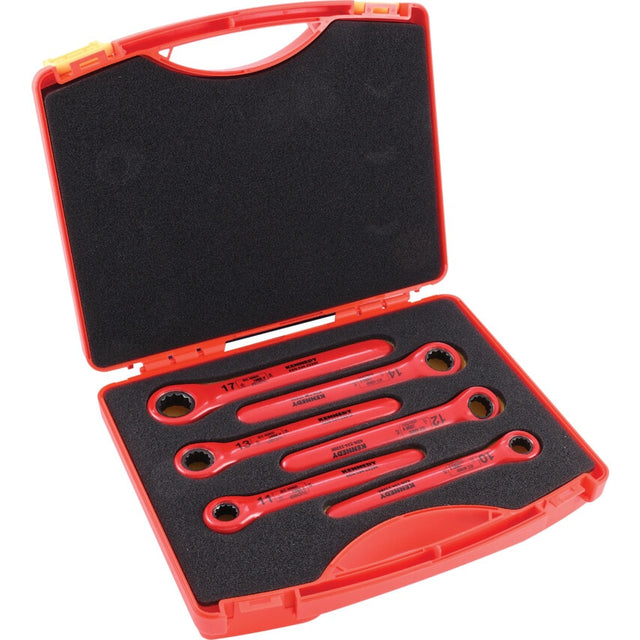 This comprehensive ratchet spanner set from Kennedy features multi-layer insulation to isolate against up to 1000 volts of electricity.