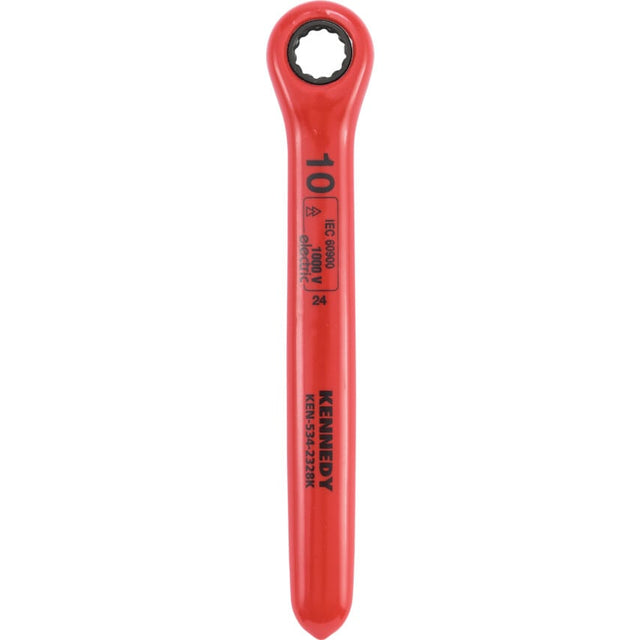 These insulated ratchet ring spanners from Kennedy feature multiple layers of safety insulation to protect against up to 1000 volts of electricity.Features and Benefits Multi-layer insulated to protect against up to 1000 volts Sizing details printed on the body of the tool for easy identification Available in a range of sizes to suit all requirementsStandards IEC 60900