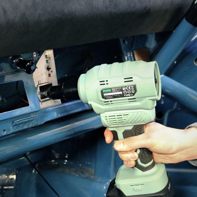 Heavy-duty 18v Brushless Riveter with huge capacity for up to 6.4mm pop rivets and 4.8mm structural rivets, such as monobolts. Designed for daily use in industry, it boasts a powerful pulling force of 9000Nm and 23mm stroke length. The high performance brushless motor and precision engineered internal mechanism provides long service life. Also features soft grip handle and removable chamber, at rear of tool, to collect spent rivet shafts. Includes four interchangeable front nozzles for various rivet sizes, from 2.4mm to 6.4mm, plus tool for quick nozzle change. Professional quality digital brushless motor works with a precision engineered internal mechanism for longer service life. Removable chamber collects spent rivet shafts. Approximately 1400 x 5mm Aluminium Rivets per 5.0Ah battery charge. Approximately 1200 x 5mm Stainless Steel Rivets per 5.0Ah battery charge. Compatible with Kielder's interchangeable TYPE18 18v Li-ion battery system. 3 year manufacturers warranty when registered with Kielder, terms and conditions apply. Specification Max Working Force: 9000Nm Max Pop Rivet Diameter: 6.4mm Max Structural Rivet (Monobolt) Diameter: 4.8mm Stroke: 23mm Weight (with 5.0Ah battery): 2.3kg Weight (with 2.0Ah battery): 1.9kg Tool Length: 202mm (without rear chamber attached) Tool Length: 275mm (with rear chamber attached) Motor: Digital Brushless Vibration: 2.5m/s2 Supplied: Riveter, 1 x 2.0Ah, Charger, 4 x Front Nozzles 2.4mm to 6.4mm, Nozzle Change Tool & Pro Carry Case