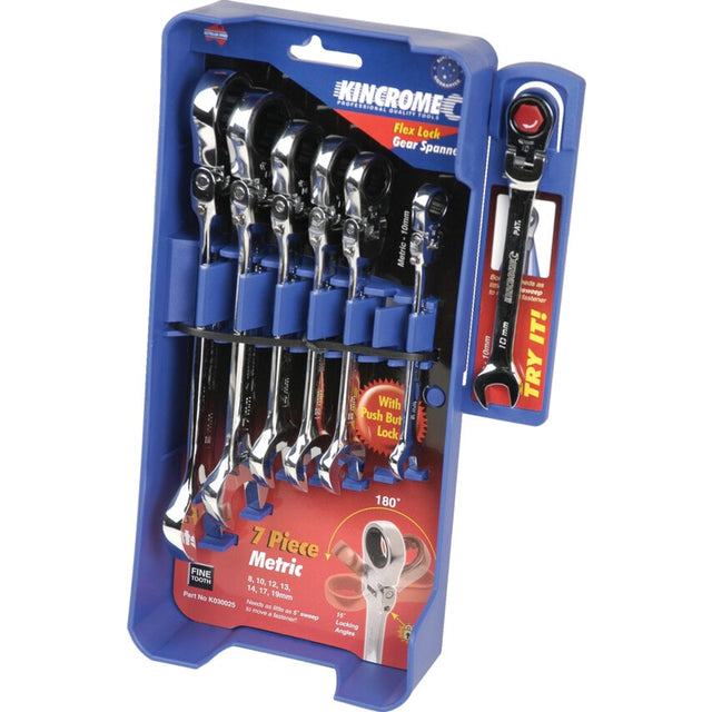 Made from chrome vanadium steel. The flexible head can lock at the desired angle - within a 180 range at 15 locking angles. The locking mechanism ensures the head will not deflect from the required working angle. The Flex Lock Gear Spanner provides outstanding torque bearing capacity while working in tight, confined areas. Ideal for use on hard-to-access fasteners. Direction indicator arrow on ratcheting ring end. 72 teeth precision gear. Ratcheting mechanism needs only five degrees of sweep to move a fastener. Includes plastic storage tray.