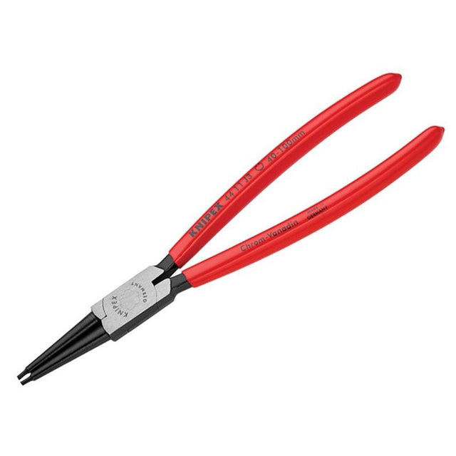The Knipex 44 11 Series Internal Straight Circlip Pliers with dipped PVC handles. Used to assemble internal circlips into bores. With solid style forged, precision non slip tips. Made from chrome vanadium electric steel, oil-hardened. Polished head. 44 11 series of internal straight circlip pliers are constructed from chrome vanadium solid style forged top quality steel with precision non-slip tips for added strength and durability. The slim head style allows use in confined areas. Like most of the Knipex range of pliers, all components are oil hardened with polished heads and plastic coated handles. Knipex circlip pliers are ideal for all trade or DIY applications and especially the automotive trade.