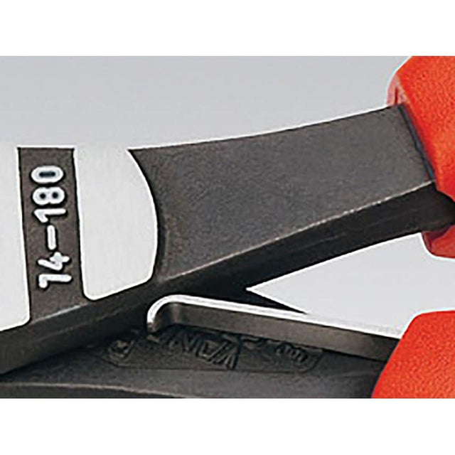 Knipex 74 01 Series High Leverage Diagonal Cutters for very tough, continuous use. Made from chrome vanadium, heavy-duty steel, forged, multi stage oil-hardened. The precision cutting edges additionally induction-hardened (cutting edge hardness approx. 64 HRC), for all sorts of wire including piano wire. Fitted with ergonomically PVC coated styled handles for added grip and comfort. They offer high cutting performance with minimum effort due to optimum coordination of the cutting edge angle and transmission ratio.