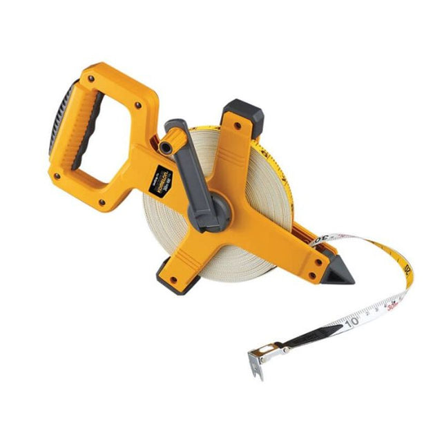 The Komelon Unigrip Fibreglass Tape has a heavy-duty ABS open frame with a built-in wire guard for added protection. The 3x high speed gear mechanism and dual rollers, guide the blade and prevent twisting. It has a double coated fibreglass blade with metric measurements on the front and imperial measurements on the back. It also features a true zero claw end hook. Accuracy: Class II