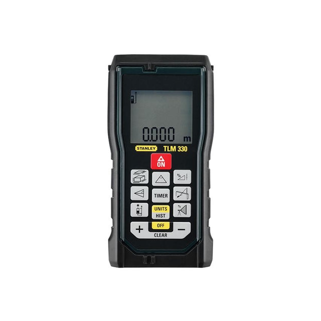 The STANLEY TLM 330 True Laser Measure allows for rapid and precise one person operation over long distances with easy to take measurements in busy or out-of-reach areas. It can measure length, area and volume up to 100m. Also has a Pythagoras function for remote measurement of high walls, Min./Max. tracking and trapezoid measurement for accurate layout. The back lit, 3 line display provides visibility in all working conditions and will store the last 20 measurements taken for reference. It also features a handy addition/subtraction calculator and a timer function with one person operation for greater productivity. The level ensures measurements are extremely accurate and it has a fitting for a camera tripod. Specification Accuracy & plusmn1mm Operating Range 0.5-100m Power 2 x AAA batteries (supplied) Operating Temperature -10-50C