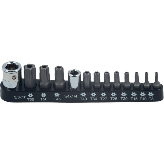 An impact-grade steel tamper-proof Security Star* bit set with 11 bits from T8 to T55, plus two chrome vanadium adapters. All contained in a labelled plastic storage rail for quick and easy bit selection.