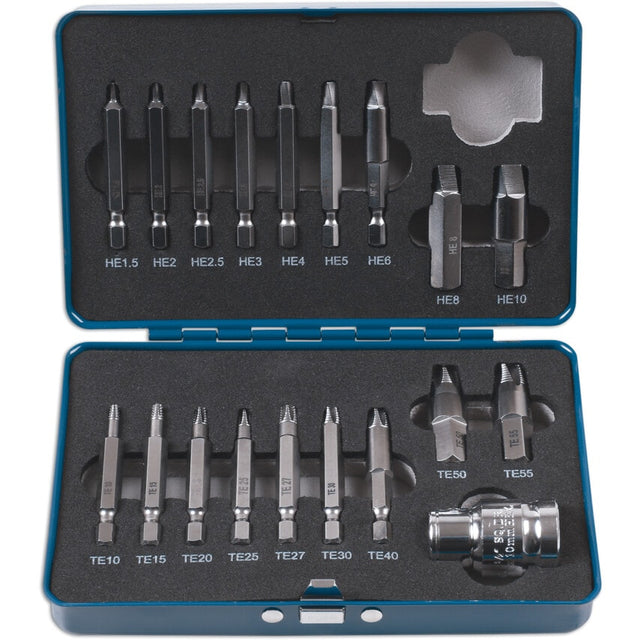 The combined 19-piece extractor set includes a variety of hex and TORX extractor bits to guarantee the removal of a wide range of damaged fixings