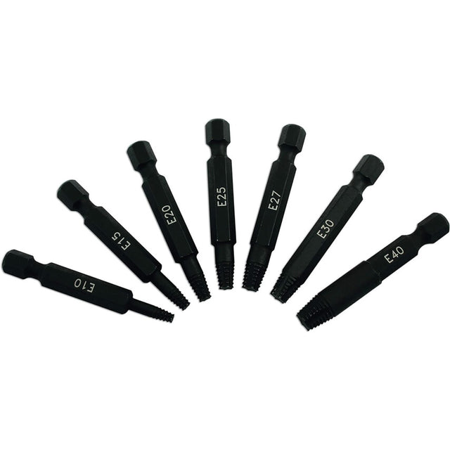 Torx fixings extractor bit set enables professionals to remove damaged fixings and includes extractor sizes, E10, E15, E20, E25, E27, E30, E40 for a wide range of uses