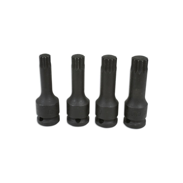 This spline bit set offers 4 bits with a 1/2in drive made from durable chrome vanadium for durability and toughness. The set offers spline bits in sizes M12, M14, M16 and M18, each 76mm long.