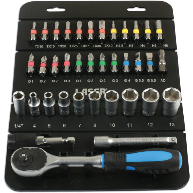 The set includes chrome vanadium sockets ranging in size from 4mm to 13mm, as well as colour-coded S2 impact grade steel bits, and an innovative folding storage case.