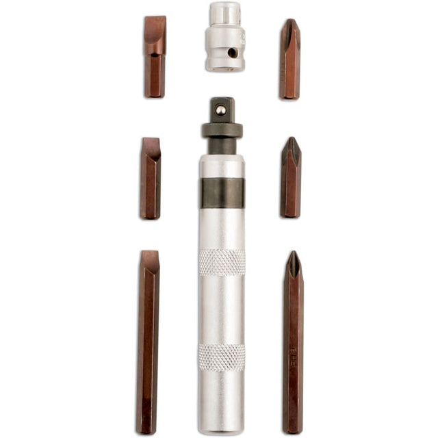 Micro impact driver set with six Phillips and Flat bits in standard and long length for releasing seized fasteners, particularly in restricted areas. The compact design ensures easy storage, even in tight spaces, making it a useful set for automotive maintenance.