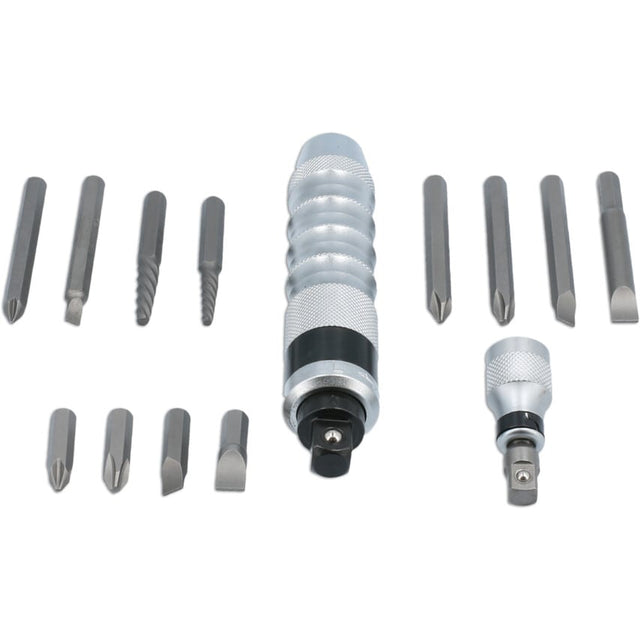A comprehensive impact driver set for the removal of stubborn or corroded screws, nuts and bolts. It can be used with both 1/2"D & 3/8"D impact sockets, it comes with a 5/16" bit holder together with hex bits, Phillips and slotted screwdriver bits, and screw extractors for the removal of damaged screws. A versatile impact driver set, including different length bits for harder to reach areas. Also includes screw extractors and the option to use 1/2"D or 3/8" sockets.