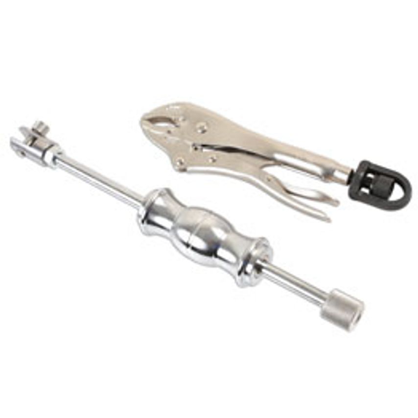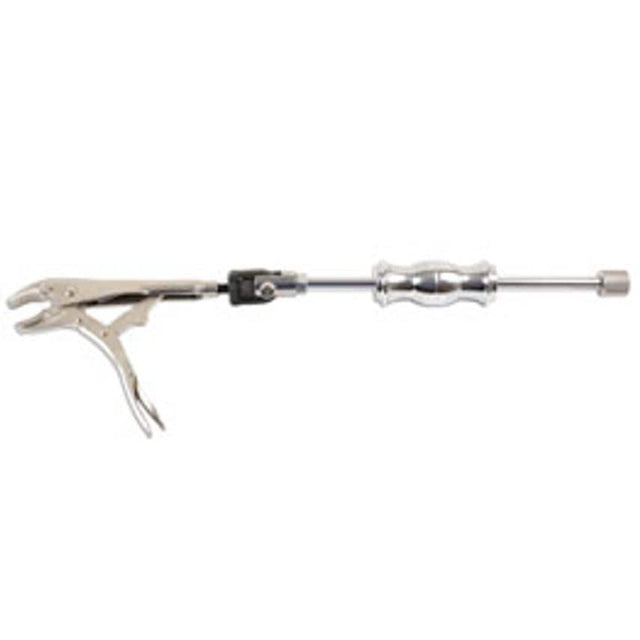 Adjustable locking pliers with detachable slide hammer, with a wide varfiety of applications, combining the ability to twist as well as pull. Automotive applications include: split pin and blind pivot pin extraction, etc.Bodyshop applications include: dent pulling using welded pins, minor jack damage to sills, etc. Woodworking applications include: wood working for nail and pin extraction. Includes 1kg slide hammer (detachable).