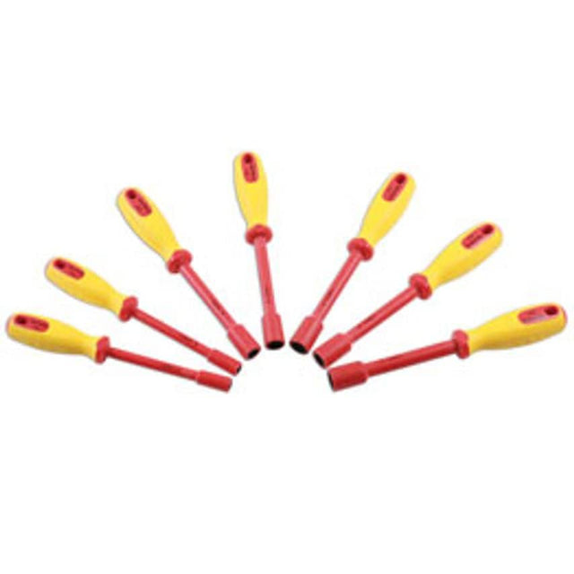 VDE Nut driver set manufactured from chrome vanadium, ideal for buried wiring harness covers. For use on live circuits up to 1000V AC or 1500V DC.Sizes: 6, 8, 10, 11, 12, 13, 14mm. Length: 125mm. Manufactured from Chrome Vanadium.