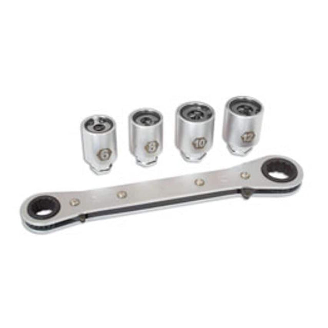 Stud extractor set in short series for tight, restricted areas and complete with a Go Thru ratchet spanner 4 x stud extractors and a Go-thru' ratchet spanner (14 & 17mm).Sizes: 6mm (OD 23.9mm), 8mm (OD 23.8mm), 10mm (OD 27.8mm), 12mm (OD 27.8mm). Spare stud extractors available, please See Laser Part Nos. 1358 (6mm), 1359 (8m), 1360 (10mm), 1361 (12mm). Supplied in a blow mould case.