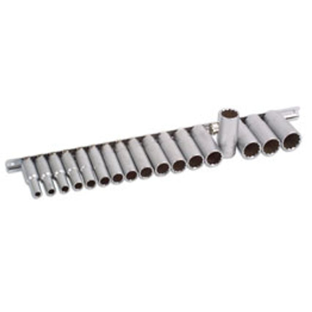 Complete set of deep Bi-Hex (12pt) 3/8"D sockets in a useful range of sizes from 6mm to 22mm. Ideal for car engine maintenance and anywhere that regular sockets are too short for access. Bi-Hex head provides 12 points of potential contact making it quicker and easier to seat the socket over most types of fastener, including square-head nuts and bolts. The size is engraved on each socket for easy identification. A quality set manufactured from satin finish chrome vanadium supplied on a socket rail for convenient, easy access storage. Socket sizes: 6, 7, 8, 9, 10, 11, 12, 13, 14, 15, 16, 17, 18, 19, 20, 21, 22mm.Bi-Hex (12pt) x 63mm long. Supplied on a socket rail. Manufactured from satin finish chrome vanadium.